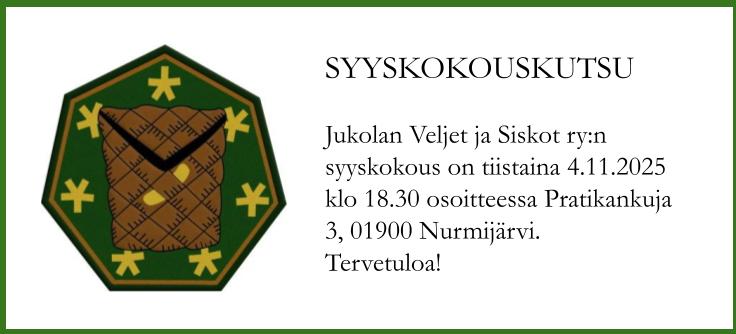 Tervetuloa Jukolan Veljien ja Siskojen sääntömääräiseen syyskokoukseen tiistaina 4.11. klo:18.30, lippukunnan kololle, osoitteeseen: Pratikankuja 3, 01900 Nurmijärvi.